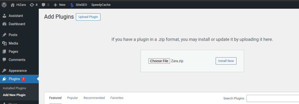Click the Upload Plugin button at the top of the page, then select the Zara.zip file you previously downloaded (also shown in Picture 1).